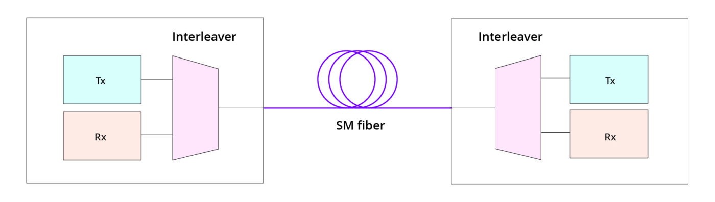 As shown in Figure 1, the traffic is interleaved so that eight odd-numbered wavelengths (λ1, λ3, …, λ15) carry data in one direction, while eight even-numbered wavelengths (λ2, λ4, …, λ16) carry data in the opposite direction. We use a high-density arrangement that features 400 GHz spacing between channels going the same way and a tight 200 GHz spacing between adjacent transmit and receive channels.