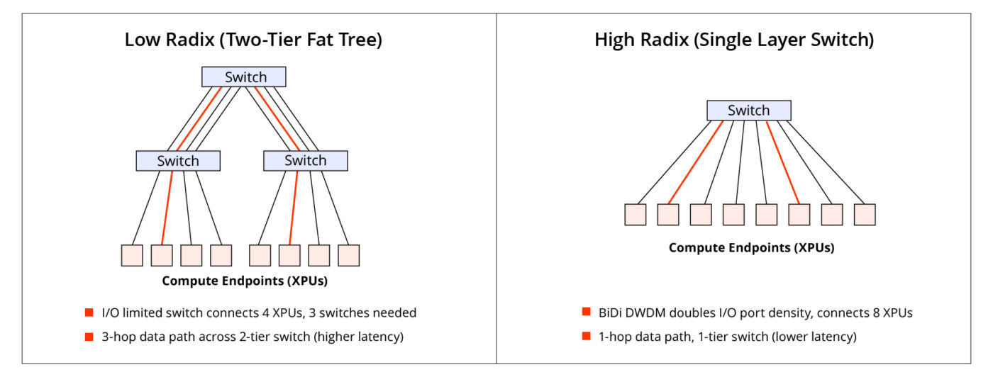 Our BiDi technology doubles the radix of a network switch without increasing the number of optical fibers in the network. A higher radix, as illustrated in Figure 3, reduces the number of hops a data packet must take to cross the network. Fewer hops mean fewer switches are needed for a given bisection bandwidth—enabling lower hardware costs and reduced power consumption. Put another way, increased radix (and bandwidth) enables larger, higher performing AI compute clusters without a corresponding increase in the number of switch tiers in their network. A network with fewer switch nodes inherently consumes less power. Finally, fewer hops translate directly into lower end-to-end latency and greater predictability. For tightly-coupled AI training workloads where GPUs are in constant communication, minimizing this latency is paramount for maximizing the overall computational efficiency. Specifically for Mixture-of-Experts (MoE) models, a higher radix allows expert parallel communications to remain within the high-bandwidth domain, preventing them from being bottlenecked by slower scale-out networks. This enables MoE models with a larger number of experts and finer-grained expert configurations, which are crucial for increasing model capacity and achieving faster training times.