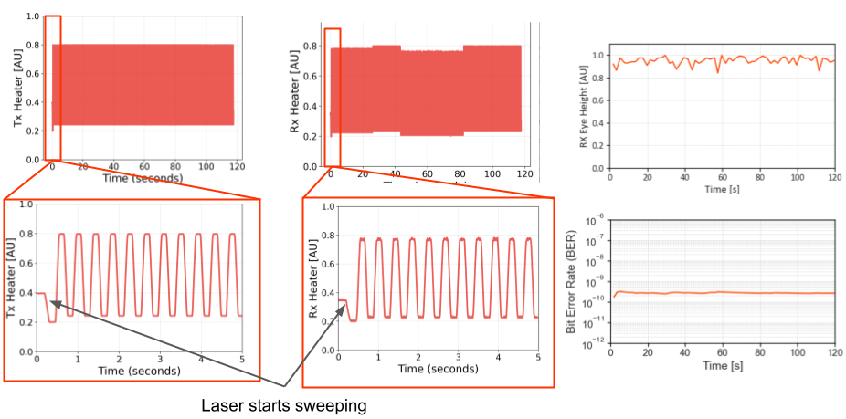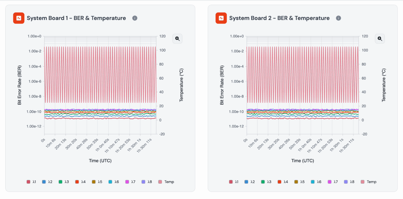 As seen in Figure 2 and the linked video, our production-ready control technology maintains a stable connection even when the hardware is repeatedly thermally cycled from 25°C to 105°C. These slower-ramp temperature cycling tests have been run for over 30 hours, with the system consistently achieving a raw BER below 10-9.