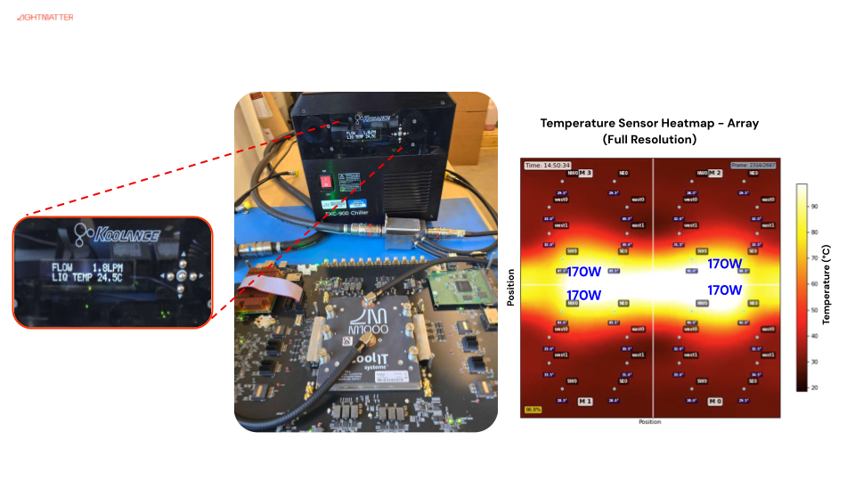 The M1000 platform delivers state-of-the-art performance, with wide-open eye diagrams, achieving a TDECQ of less than 1 dB, well below the maximum 3.4 dB specified in IEEE 802.3. Furthermore, the M1000 platform is designed for resilience. It features Lightmatter’s reconfigurable Optical Circuit Switching (OCS), which allows data to be dynamically rerouted to backup optical paths in the event of a fiber or component failure. We’ve also proven the platform’s ability to handle the immense thermal load from co-packaged chips, demonstrating stable operation with power densities exceeding 1.4 W/mm2 (supporting multi-kilowatt XPU complexes), as shown in Figure 1.