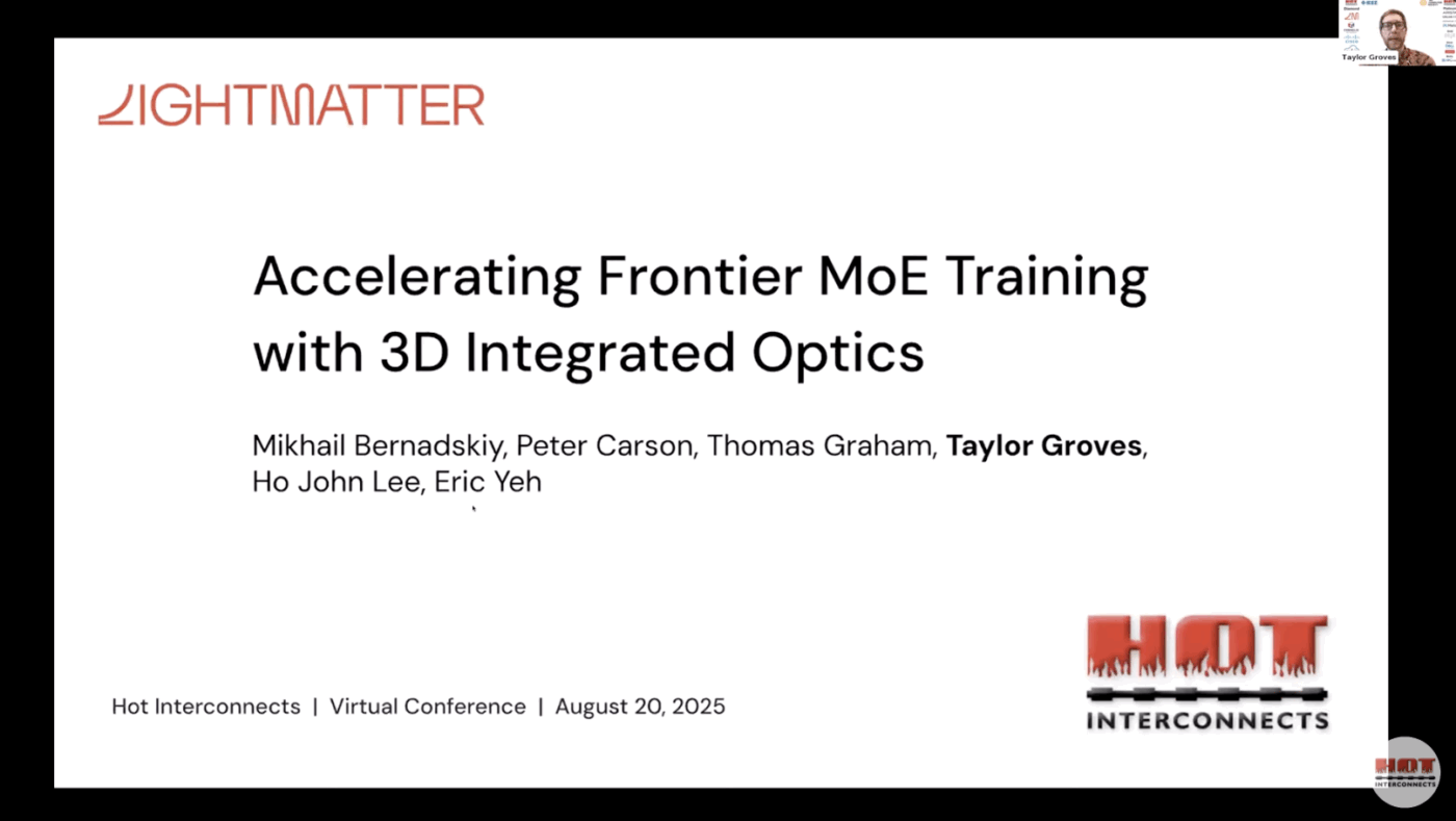 Abstract: In a new era of AI, high-speed interconnects are becoming the new scaling engine as traditional semiconductor scaling slows. This presentation explores how 3D-stacked optics can link thousands of GPUs across multiple data center racks, overcoming the distance limitations of traditional copper interconnects while meeting aggressive power and performance targets. Our modeling demonstrates how Passage 3D photonic interconnects enables a substantial increase in scale-up capability, resulting in a 2.7X reduction in the time needed to train massive AI models like Mixture of Experts (MoE) models. This advancement unlocks new opportunities for model scaling and performance.