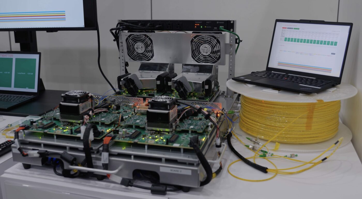 This demo showcases Lightmatter’s Passage EVK100 system, featuring a 16-wavelength DWDM unidirectional optical link delivering up to 1.6 Tbps per fiber using 112 Gbps PAM4 signaling.